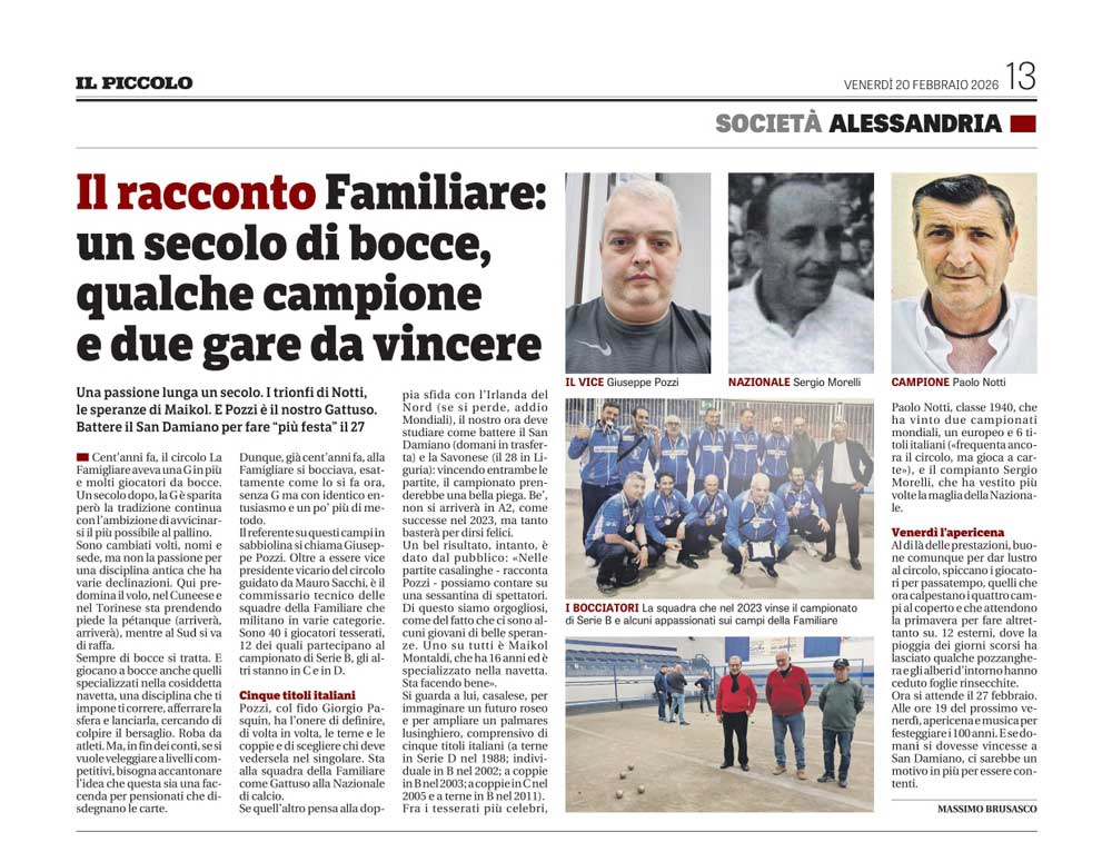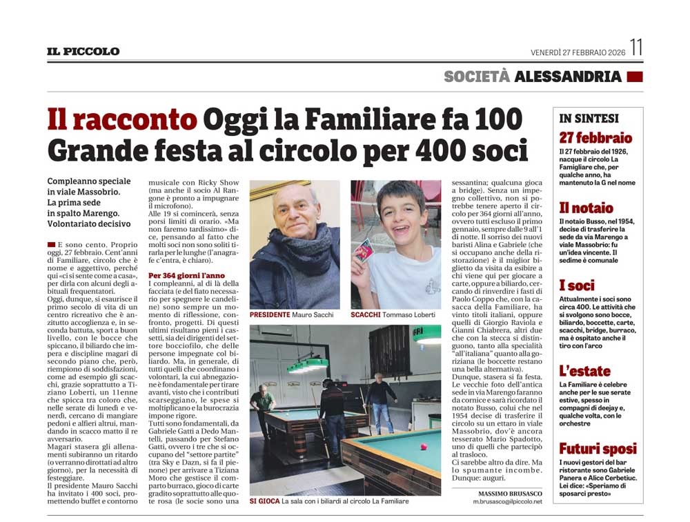 Il 27 febbraio 2026, il Circolo La Familiare di Alessandria ha festeggiato i suoi primi cento anni di attività, condividendo con soci e cittadini un traguardo che rappresenta memoria, appartenenza e futuro.